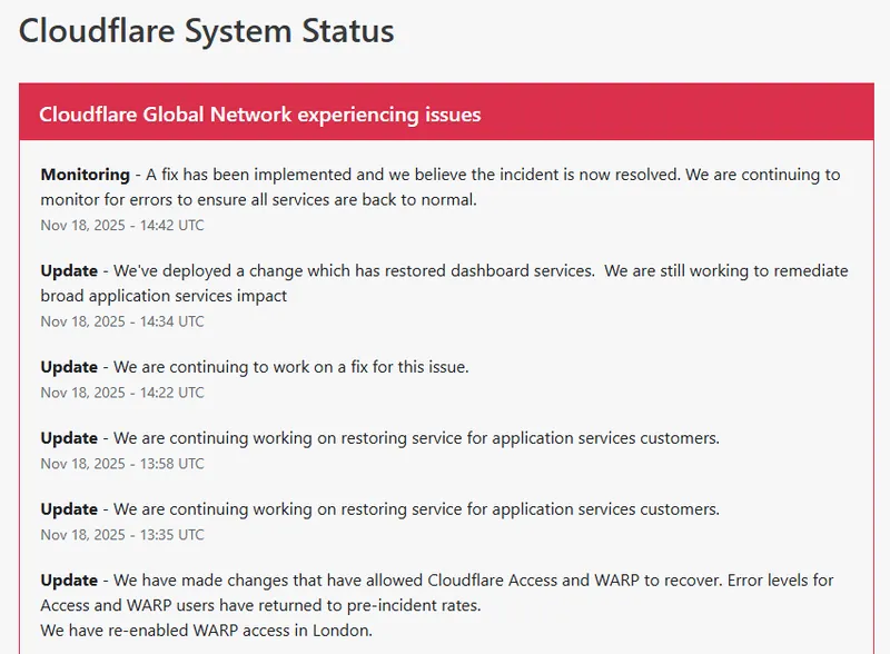 2025.11.18 (ඊයේ), ලොව පුරා වෙබ් අඩවි දහස් ගණනකට ප්රධාන අන්තර්ජාල බාධාවක් බලපෑවේය. වෙබ් අඩවි ආරක්ෂා කිරීමට සහ වේගවත් කිරීමට උපකාරී වන දැවැන්ත සමාගමක් වන Cloudflare හි ඇතිවූ ගැටුලු හේතුවෙන් මෙම ඇනහිටීම සිදුවී ඇති බව වාර්ථා වේ.